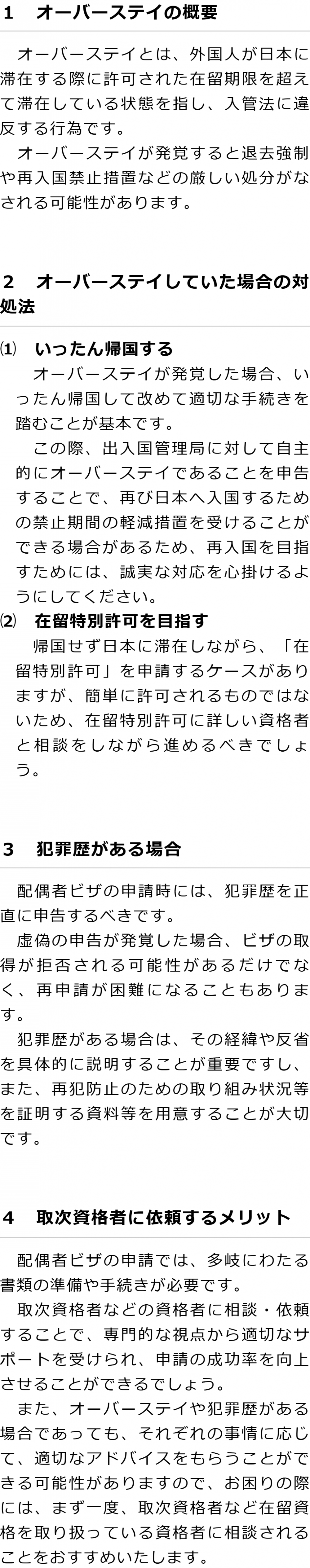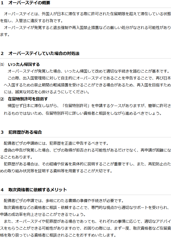 トップこんなお悩みはありませんか?オーバーステイ・犯罪歴があるがどうすればいいか 階層構造▼ こんなお悩みはありませんか?(目次) オーバーステイ・犯罪歴があるがどうすればいいか こんなお悩みはありませんか?(目次)こんなお悩みはありませんか?トップ配偶者を海外から呼び寄せたい配偶者ビザへ切り替えたい配偶者ビザを更新したい短期滞在ビザから配偶者ビザに変更をしたい留学ビザから配偶者ビザに変更したい配偶者ビザを取得したいが、何をすればいいのか分からない離婚歴があり申請が通るか不安夫婦の年齢に差があり申請が通るか不安収入が少ないため申請が通るか不安ネットで知り合ったが、偽装結婚の疑いからビザが得られるか不安オーバーステイ・犯罪歴があるがどうすればいいか国籍別の結婚手続きについて知りたい 受付時間 平日 9時~21時、土日祝 9時~18時 夜間・土日祝の相談も対応します (要予約) 所在地 〒510-0075 三重県四日市市安島1-2-29MIZUTANIビル3F 0120-41-2403 お問合せ・アクセス・地図